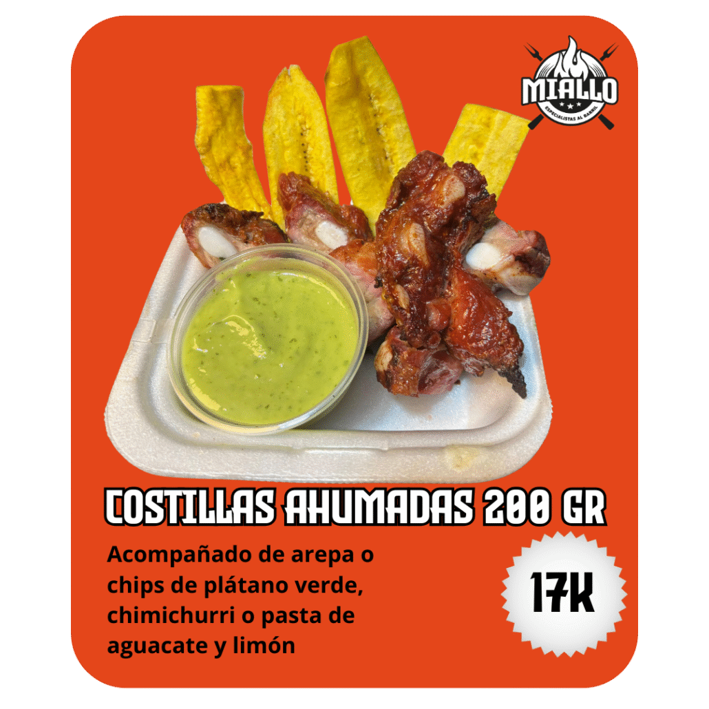 Acompañado de arepa o chips de plátano verde, chimichurri o pasta de aguacate y limón
